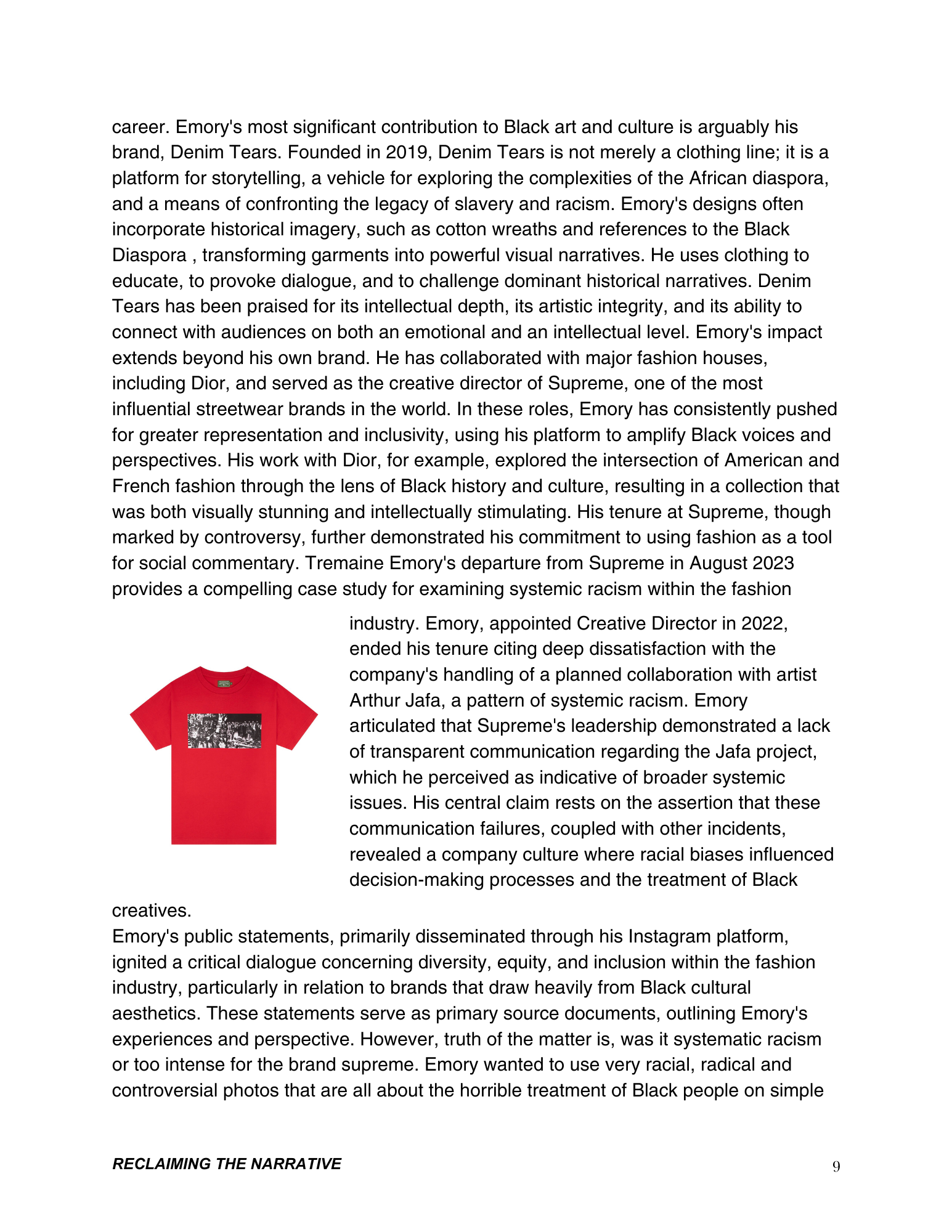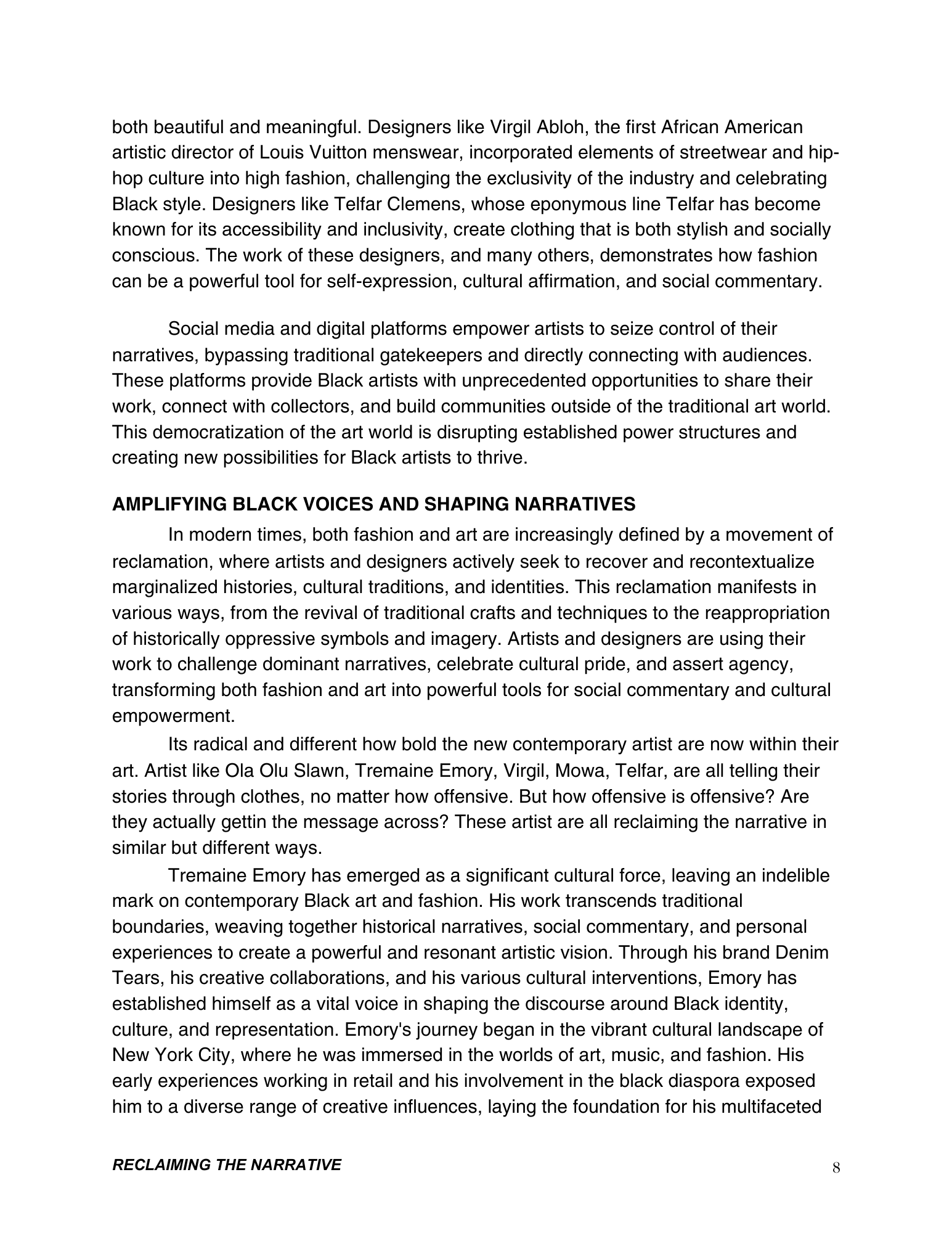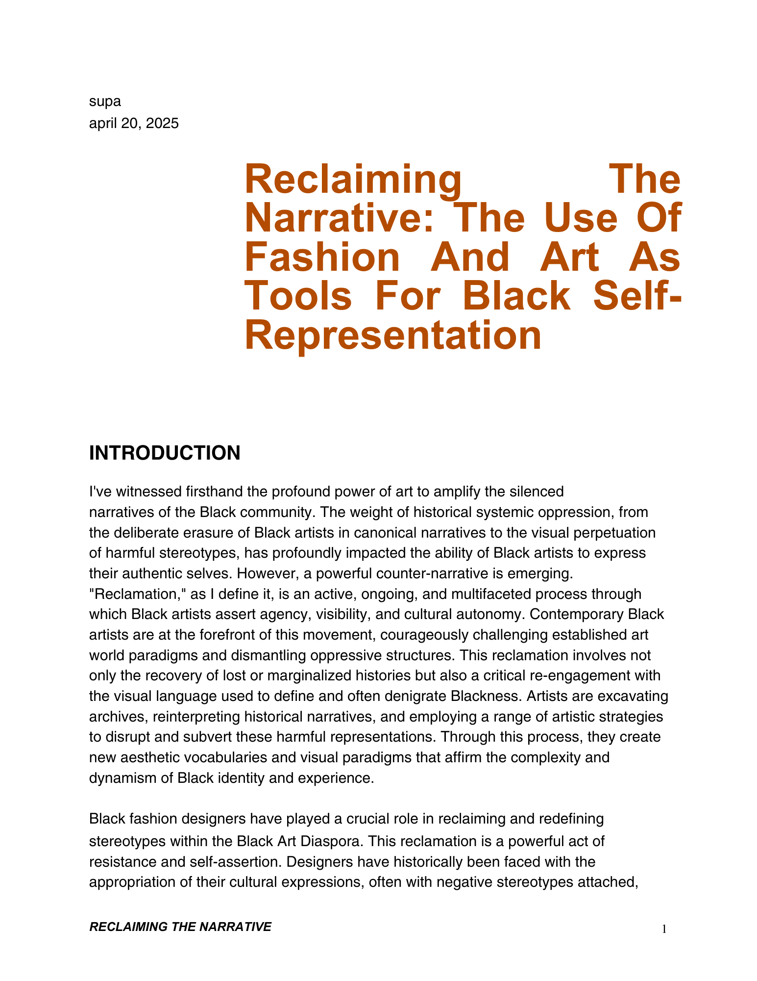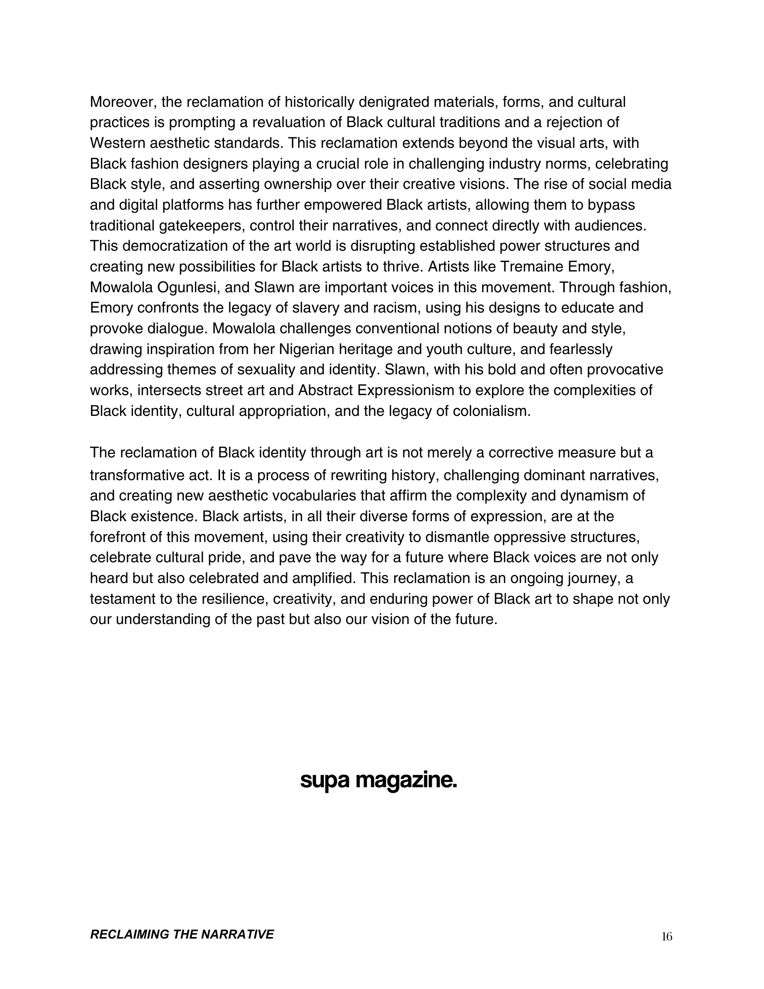 furthermore, the "value" is tied to the stakes of the work. when artists like tremaine emory or telfar clemens create, they are often using their platform to challenge exclusive power structures that have kept black creativity at the margins while simultaneously appropriating its "cool." there is a profound depth in art that carries the weight of a diaspora's resilience. it isn't just about beauty; it’s about the labor of reclaiming our culture and turning a history of erasure into a vibrant, living future. this sense of urgency and the necessity of the message is the reperations we give our selves, because who the hell gon do it for us.