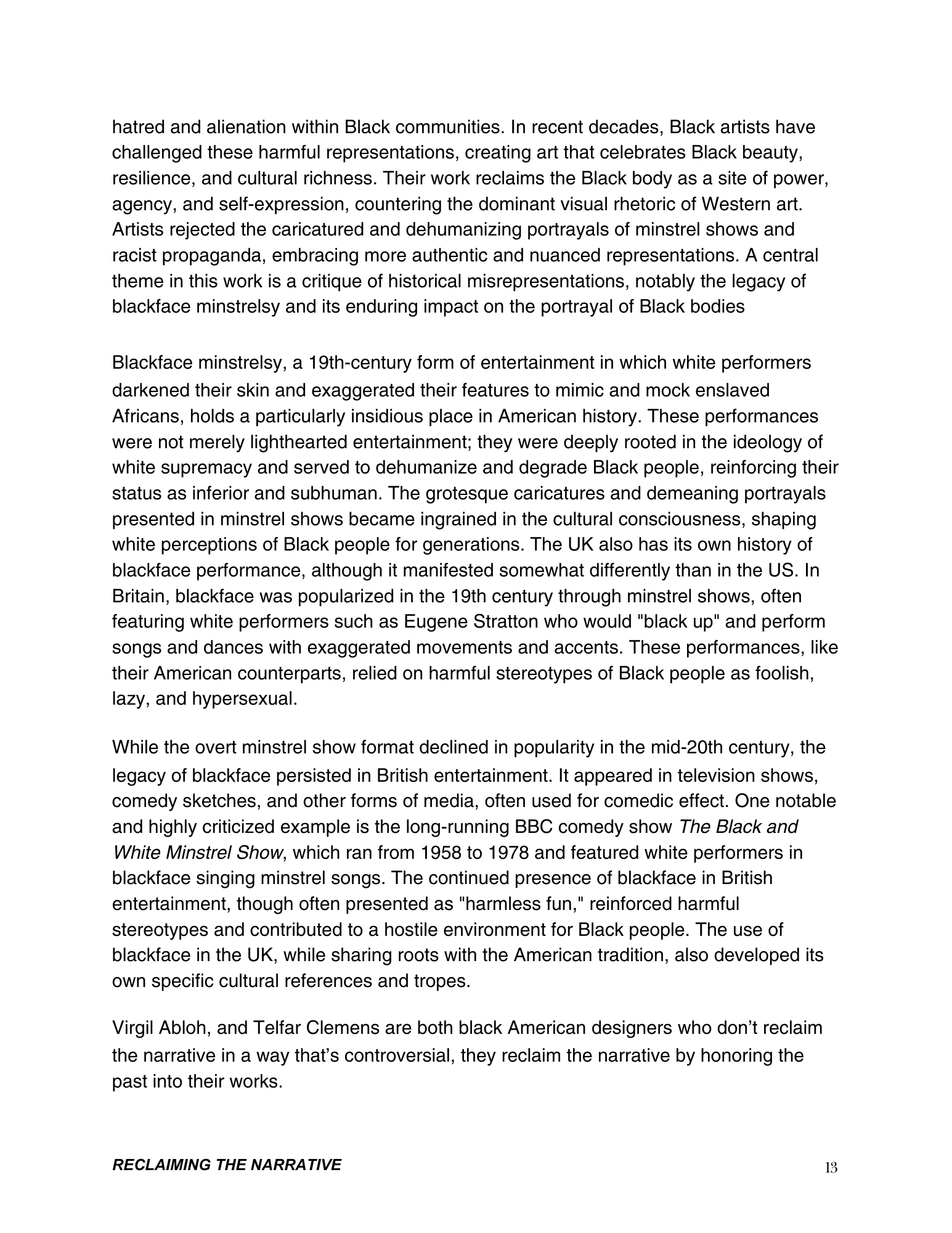 artists are excavating archives, reinterpreting historical narratives, and employing a range of artistic strategies to disrupt and subvert these harmful representations . through this process, they create new aesthetic vocabularies and visual paradigms that affirm the complexity and dynamism of black identity and experience . black fashion designers have played a crucial role in reclaiming and redefining stereotypes within the black art diaspora . this reclamation is a powerful act of resistance and self-assertion . designers have historically been faced with the appropriation of their cultural expressions, often with negative stereotypes attached, being used without credit or understanding . this is particularly significant given fashion's role as a potent signifier of identity, culture, and social status.