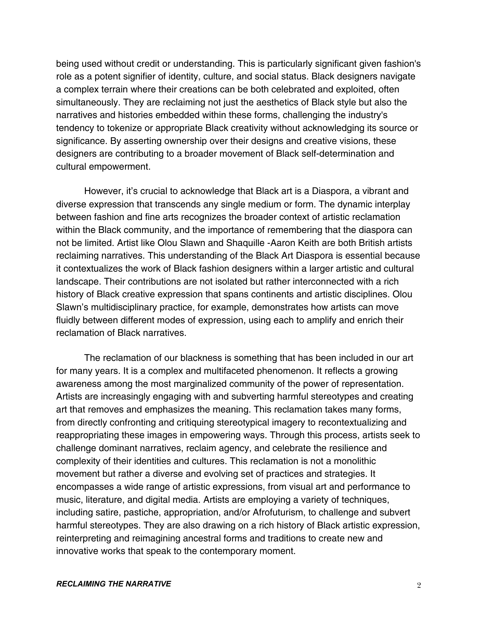 black designers navigate a complex terrain where their creations can be both celebrated and exploited, often simultaneously . they are reclaiming not just the aesthetics of black style but also the narratives and histories embedded within these forms, challenging the industry's tendency to tokenize or appropriate black creativity without acknowledging its source or significance . by asserting ownership over their designs and creative visions, these designers are contributing to a broader movement of black self determination and cultural empowerment . however, it's crucial to acknowledge that black art is a diaspora, a vibrant and diverse expression that transcends any single medium or form . the dynamic interplay between fashion and fine arts recognizes the broader context of artistic reclamation within the black community, and the importance of remembering that the diaspora can not be limited.